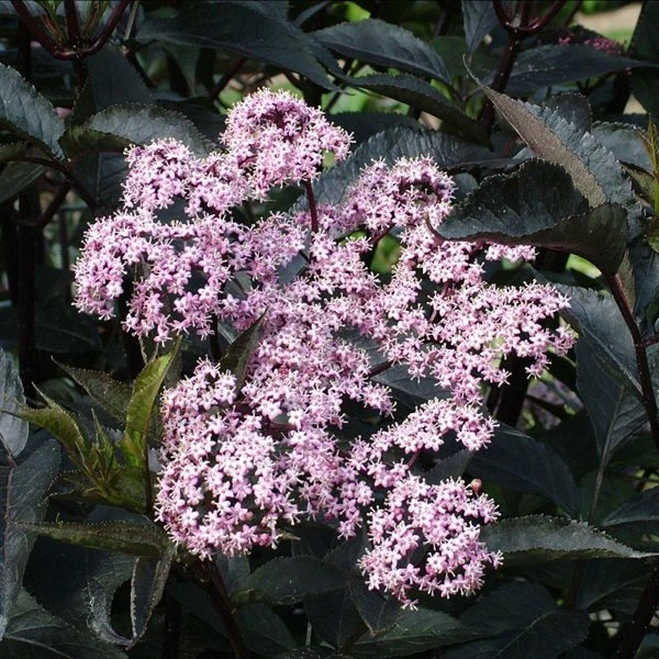 Hyld (SAMBUCUS NIGRA `Black Beauty`) er en kraftig, bred opret busk med utrolige smuke, store rosa blomster.